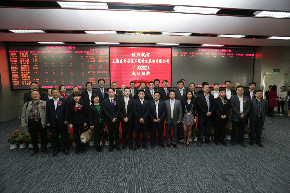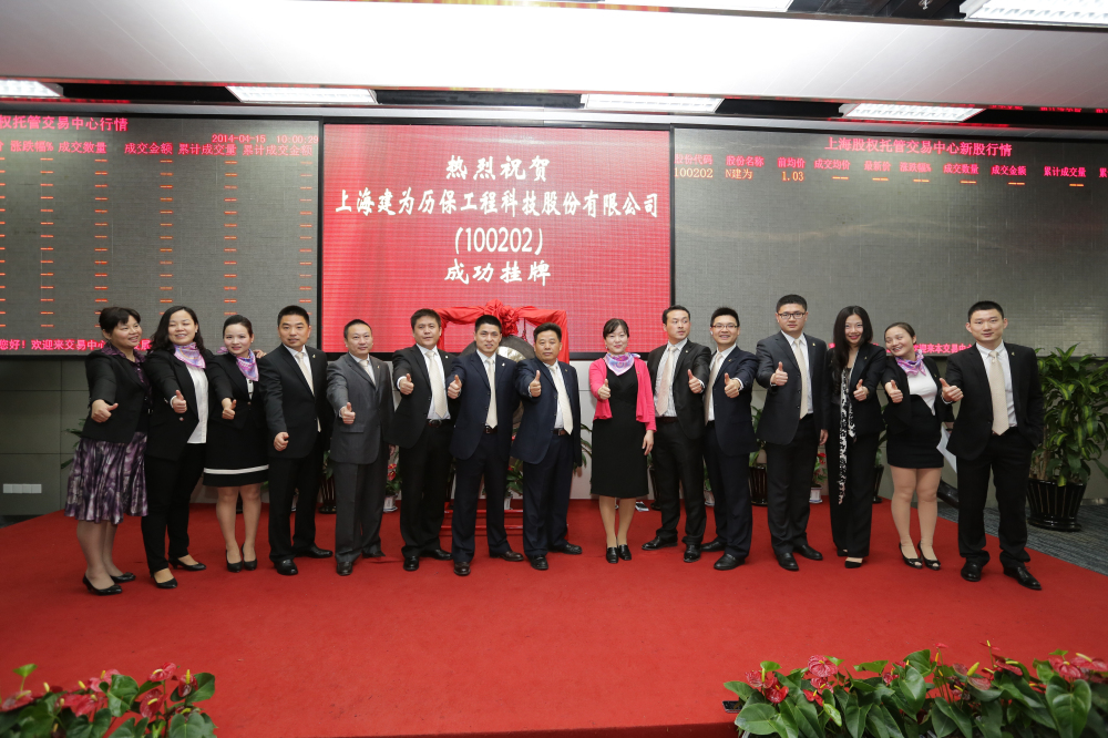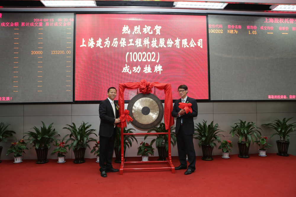 2014年4月15日9:30,上海股权托管交易中心一楼,建为历保董事长郭伟民与上海文物局副局长褚晓波共同敲响交易所的大钟,随着这声标志着成功持牌上市的清脆铜锣声被敲响,交易大厅屏幕用红色大字显示“上海建为历保工程科技股份有限公司成功挂牌上市,股票代码100202”。这也标志着上海建为历保工程科技股份有限公司(简称建为历保)在上海股权交易中心成功挂牌上市。