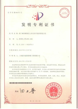 “基于破损硬基层上的无损可逆的修复方法”为上海建为建筑修缮工程有限公司于2010年1月申报的发明专利,2011年11月由国家知识产权局授权公告。该专利技术为修缮公司在历史建筑保护行业的核心竞争力之一,自申报之日起,我司组建了专业的科研团队对之进行研发、孵化和改良,现已成功转化为基于历史建筑中破损硬基层无损可逆修复的高新技术,并于2013年7月15日被上海市科委登记为“上海市科学技术成果”,并颁发证书。
