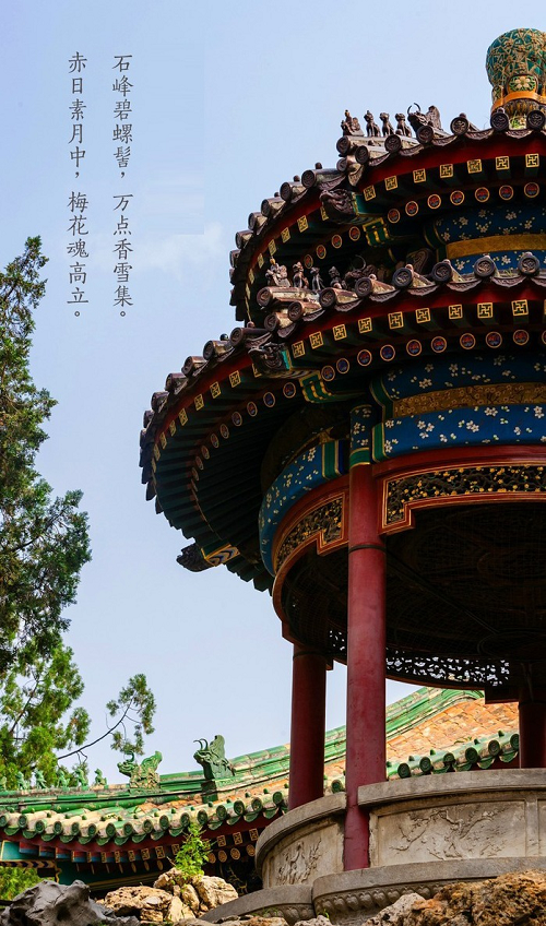 碧螺亭平面呈梅花形,五瓣形须弥座,五柱五脊,重檐攒尖顶,上层覆翡翠绿琉璃瓦,下层覆孔雀蓝琉璃瓦,上下层均以紫晶色琉璃瓦剪边,上安束腰蓝底白色冰梅宝顶。每层五条垂脊,分为五个坡面,亦仿梅之意。亭柱间围成弧形的白石栏板上雕刻各种梅花纹图案。柱檐下安装透雕折枝梅花纹的倒挂楣子。亭内顶棚为贴雕精细的梅花图案天花。上下檐额枋彩画为点金加彩折枝梅花纹苏式彩画。亭前檐下悬乾隆御笔“碧螺”匾。亭南架一石桥,通萃赏楼二层,东西有石阶,可通山下。碧螺亭形体别致,色彩丰富协调,是极为罕见的亭式建筑。