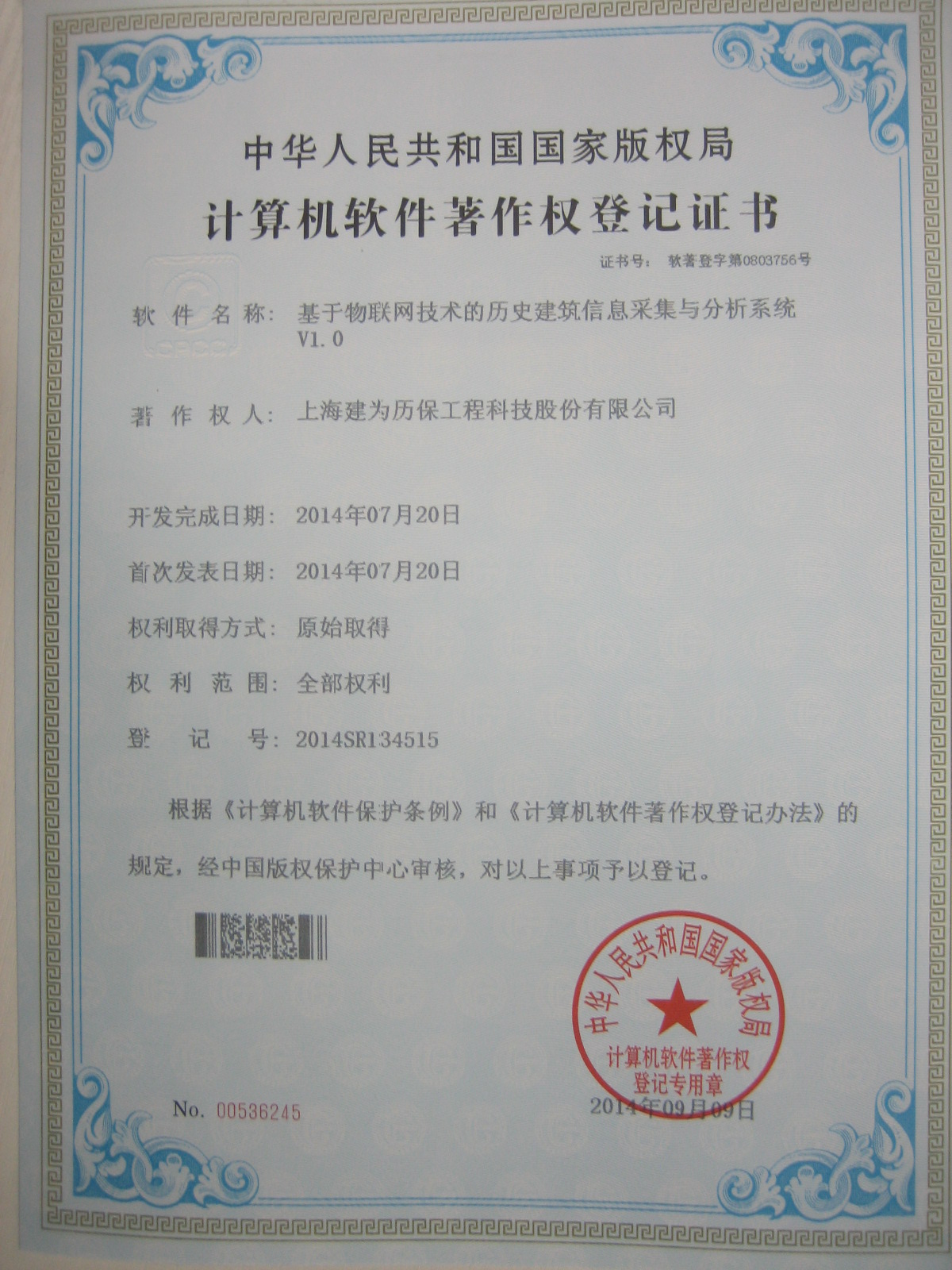 结合上海建为历保多年来对历史建筑修缮保护的经验,经过物联网事业部研发人员努力攻坚开发的《基于物联网技术的历史建筑信息采集与分析系统V1.0》系统于2014年9月9日通过了中华人民共和国版权局的认定。在此感谢各位领导各位员工。