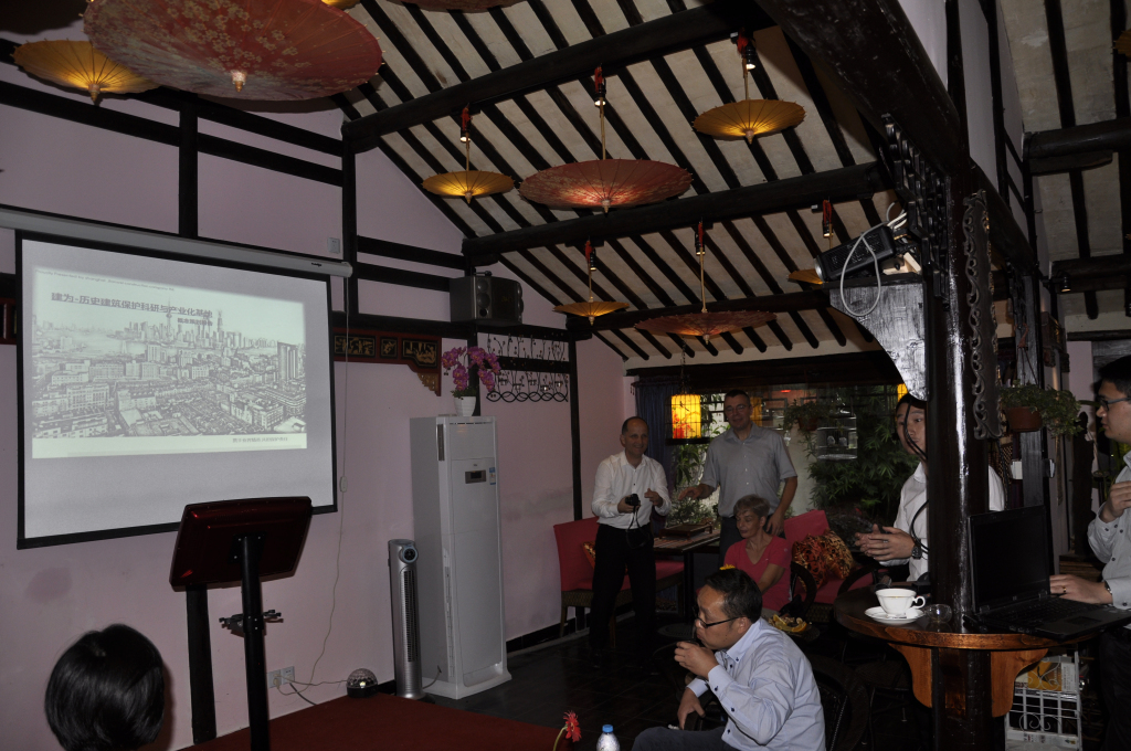 我司以引进国外先进理念、促进国内外行业发展为己任。2013年10月11日,作为主办方组织中德专家在浦东新区新场古镇内举办了一场以历史建筑保护行业准则与技术、理念为主题的交流会。德方与会专家有汉堡市文化部历史遗产保护执行官Christoph Schwarzkopf等;国内业界与会专家有:上海市房地产科学研究院陈洋院长,上海市规划和国土资源局刘夏夏处长,上海现代建筑设计(集团)有限公司历史建筑保护设计研究院卓刚峰院长,上海交通大学曹永康教授,上海章明建筑设计事务所有限公司沈晓明董事、蔡颖佶总工等;新场古镇开发有限公司总经理也参与了本次交流会,我司侯实博士、刘超经理、设计师钱军军、技术专家周亮和曹勇参与了本次交流会。
