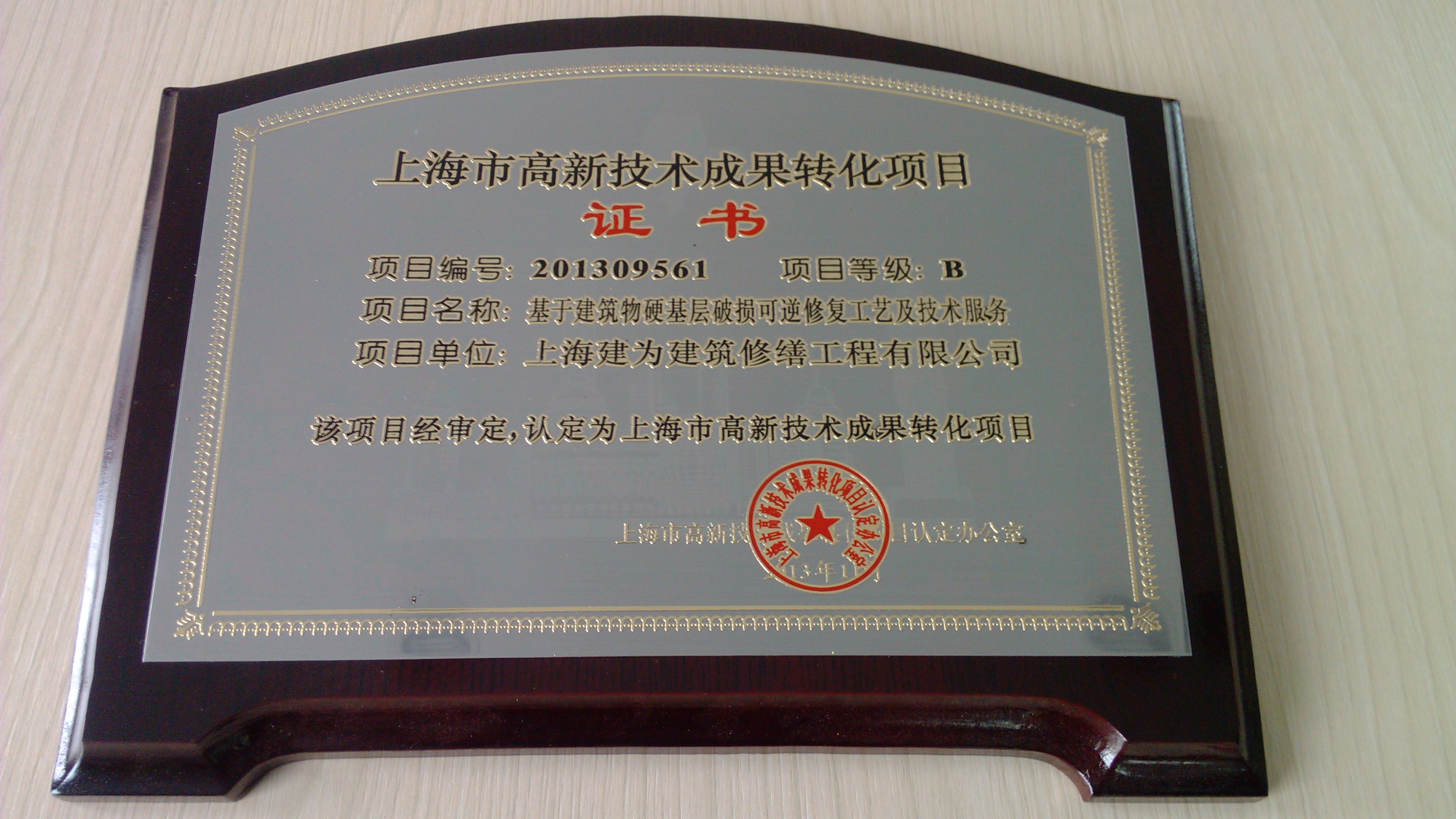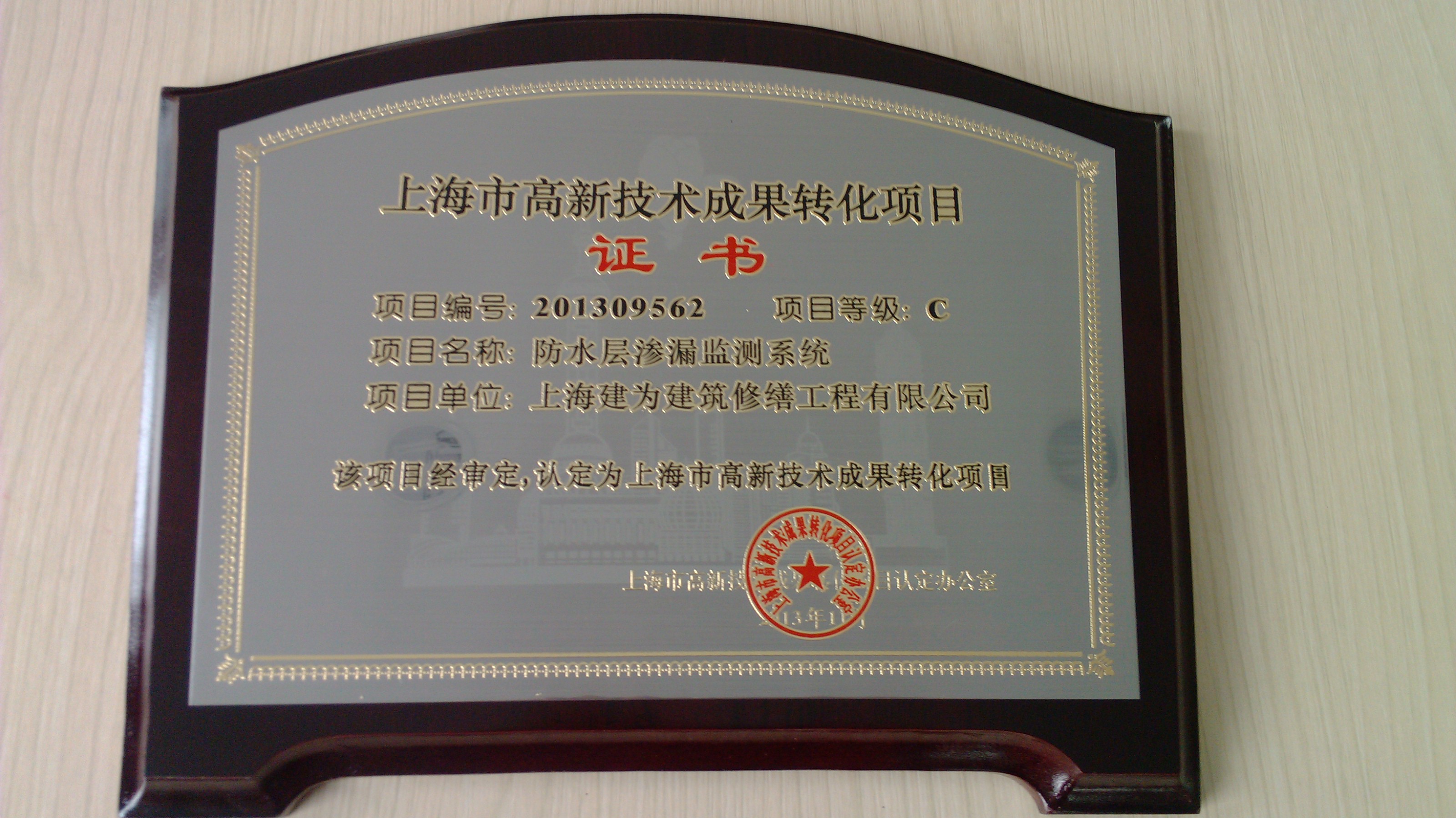 2013年11月28日,上海市高新技术成果转化项目(以下简称“高转项目”)认定办公室向上海建为建筑修缮工程有限公司颁发了两项成果证书,分别为《基于建筑物硬基层破损可逆修复工艺及技术服务》、《防水层渗漏监测系统》。我司技术部曹勇代表公司参加了颁证仪式,在会上高转项目认定办公室强调企业在高转项目获得认定后将享受政府财政专项资金扶持政策和人才引进政策,各公司要充分用好政策,享受好政策。