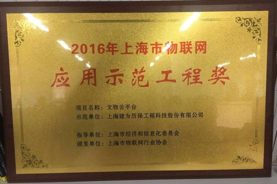 2017年5月17日,上海市临港经济发展(集团)有限公司与上海市物联网行业协会全面合作签约仪式暨上海市物联网联合开放实验室揭牌仪式在宝山区新业坊召开。临港集团副总裁翁恺宁、物联网行业协会会长蔡小庆、宝山区区长范少军、市经信委副主任傅新华发表了重要讲话。宝山区副区长吕鸣、临港集团总裁袁国华以及相关领导出席会议。会上,建为历保独立研发的“文物云平台“凭借其平台成熟度、技术先进性、市场广阔性、行业示范性等优势,从上海市众多优秀物联网平台中夺颖而出,获得上海市经济和信息化委员会认定的、上海市物联网行业协会颁发的“2016年上海市物联网应用示范工程奖”。
